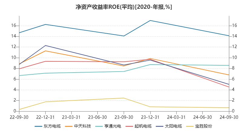 凭证杜邦分析恒等式,东方电缆、中天科技、亨通光电等行业龙头均保捏着较强的盈利才气,而起帆电缆、太阳电缆、宝胜股份则具有更高的钞票欠债率与钞票盘活效果。从最终的投资陈诉推崇上看,起帆电缆、太阳电缆和主要龙头企业的差距甚微。 相比各企业连年ROE推崇,除东方海缆ROE终年在显赫高于同行的14%以上、宝胜股份ROE运转在2%以下的行业低点之外,其余4家未有太大差距,23年均在9%傍边,24年前三季度均跌落至更低区间。