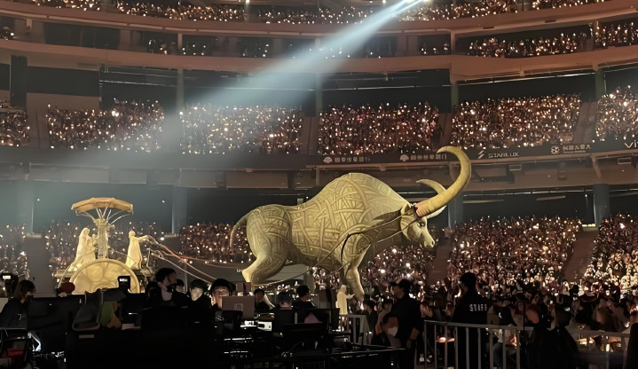 01 演唱会总插足约9亿新台币(折合2亿东说念主民币),其中舞好意思制作占总老本33%,约6600万东说念主民币。舞台包含30米机械蛇、金色公牛、飞马等20余组大型机械装配及360°全景设想,输送及硬装用度腾贵。